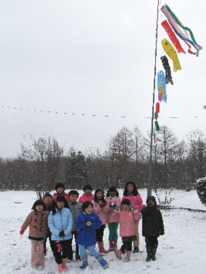 本日の緑の時間はこいのぼり集会を行いました。 先週作ったこいのぼりを揚げたところ、ちょうど良い風が吹いて元気に泳ぎ始めました。 雪が降って少し寒かったですが、元気に泳ぐこいの姿が見られて良かったです。 ちなみに1・2年生のミニこいのぼりも一緒に揚げました。 最後にみんなで記念写真。 こいに負けじと元気な緑っ子でした! 文責:とも PR | カウンター