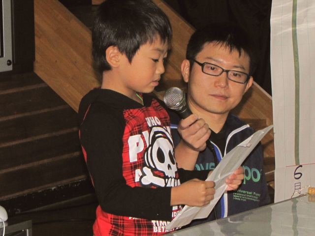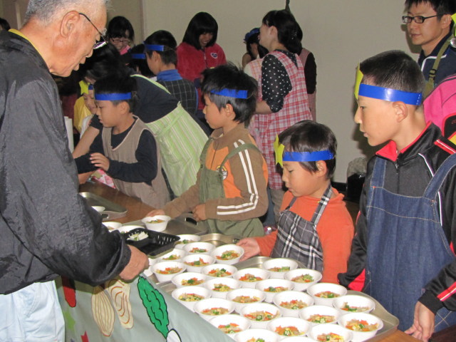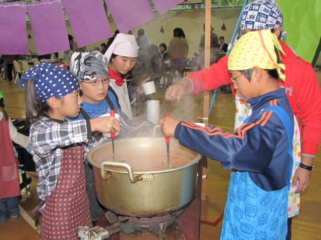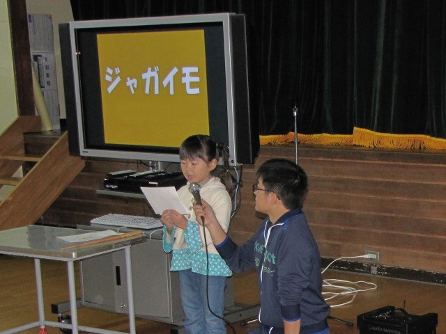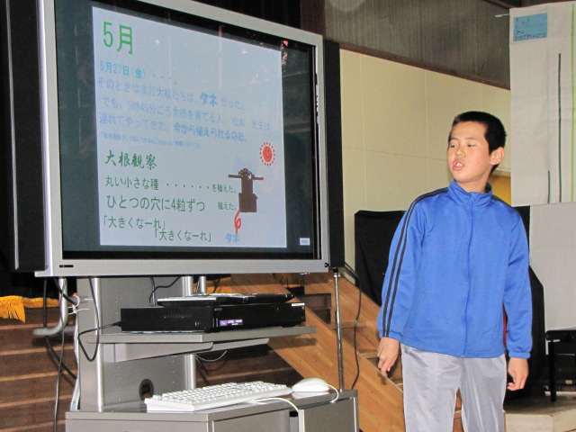 先生の指示のもと、沢山の人に喜んで貰えるようがんばっていました。 どうしても高学年と比べるとできる事に限りのある低学年の子達も自分のできる事に集中して取り組んでいました。 今年は前日にある程度下準備をしていたので調理作業はスムーズに進んでいった気がします。 それからしばらくして調理も一段落ついたころ、体育館には少しずつ来場者が。 エプロンや三角巾を一旦片付け、観察記録発表会のスタートです。 今年は電子黒板を利用して発表をする子もいました。 それぞれに個性が出て面白い発表でした。 動画:6年生の発表(音量注意) ※一部の携帯電話からは見られません。 観察記録発表会のあとは収穫祭の始まりです。 子どもたちが育てた野菜を使ったメニューはいかがだったでしょうか? ちなみにメニューの詳細については給食ブログをご覧下さい。 文責:とも PR コメントを投稿する