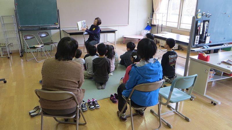 清里町で活動している読み聞かせサークル「清里おはなし会」の方3名と、本校の保護者の方1名の計4名による読み聞かせでした。