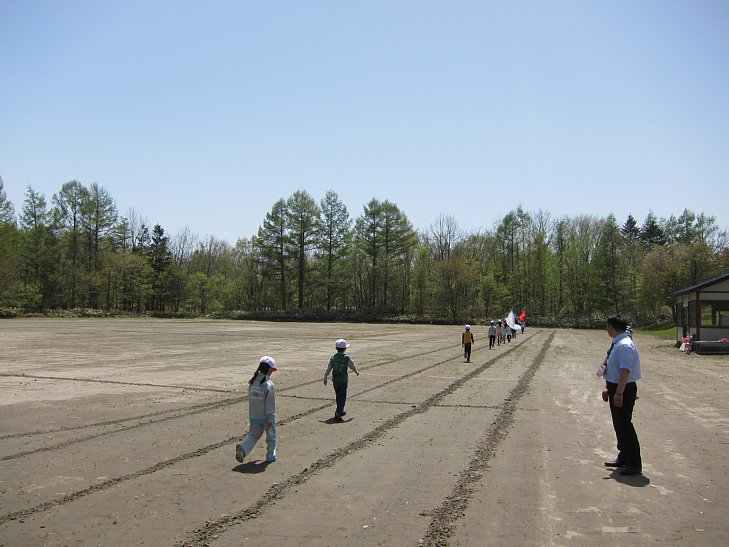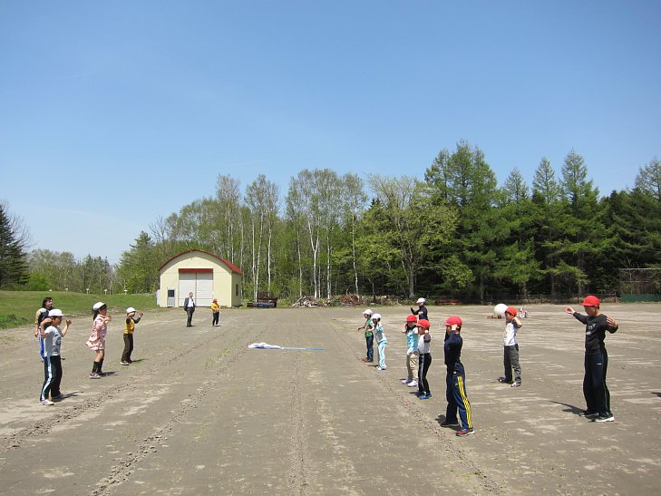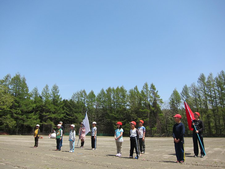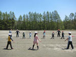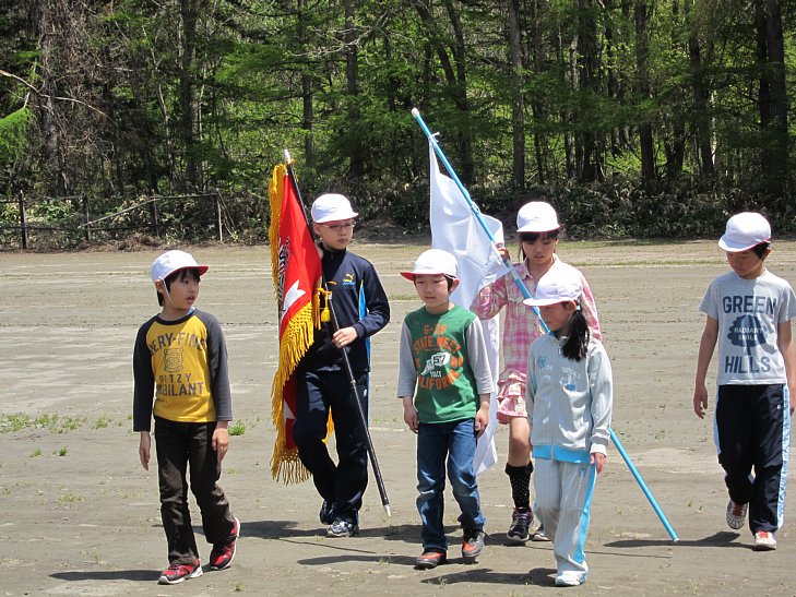 強風の中、優勝旗や紅白の旗を持って歩く子たちは大変そうでしたが、足並みをそろえて行進する練習をしたり、タイミングを合わせて礼をする練習(これがなかなか難しい!)、ラジオ体操の練習等をしたりして、久々の太陽の光を楽しみながら練習に励みました。