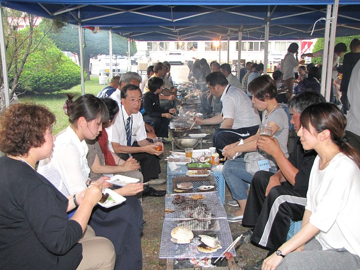 式典の後には、緑町小校舎前にて夕食会が行われました。参加された方々は、焼き肉をつつきながら数年振りの再開を喜び、昔話に花を咲かせていました。