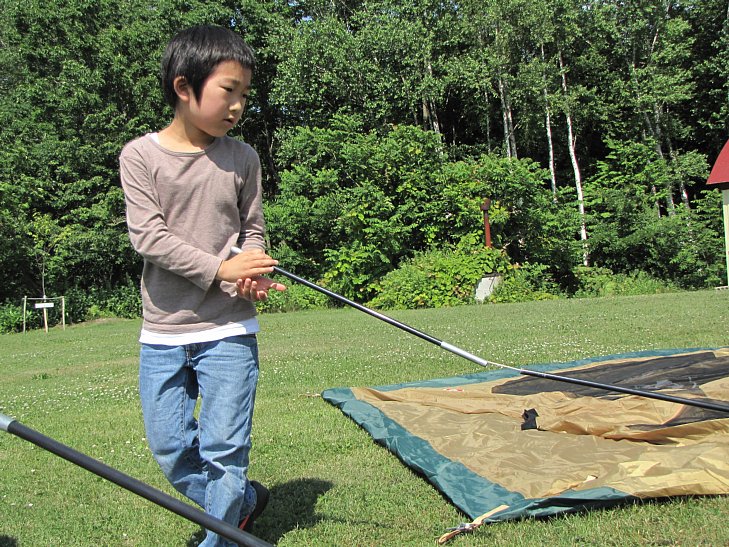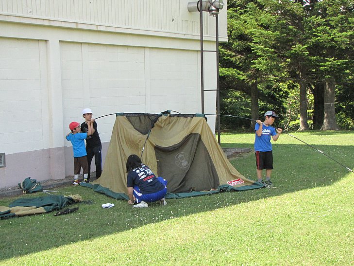 7月24・25日には全校キャンプを行いました。グラウンドのリンク小屋前で開会式を行い、テント張りへ。