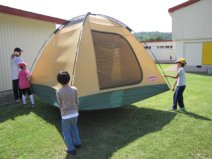 テントの数は3張。それぞれのチームが力を合わせてあっという間に張り終わることができました。その後はお楽しみ会。児童会三役と6年生で企画した「どろけい」と「宝探し」を行いました。