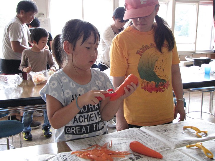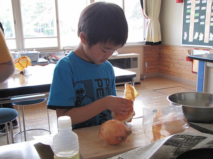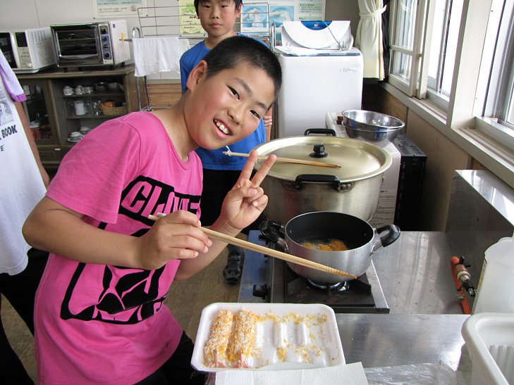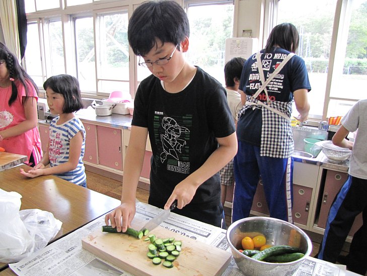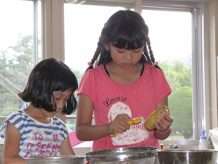 その後は夕食作りでした。運動会の時の紅白のチームに分かれて準備します。どちらのチームもカレーでしたが、サラダを添えたり、エビフライやコロッケ等の揚げ物に挑戦したりと、それぞれ工夫を凝らしていました。