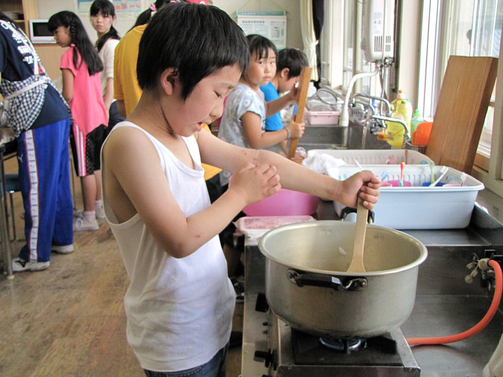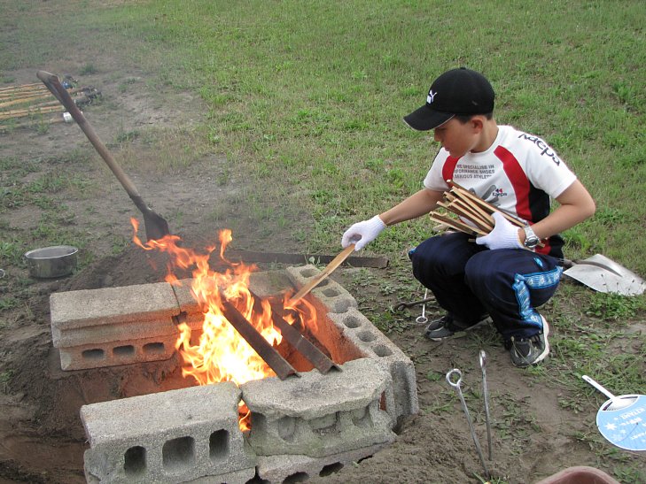 ご飯はブロックでかまどを作り、飯盒で炊きます。普段はスイッチ一つで炊きあがるご飯。使い慣れない飯盒での炊飯はなかなか難しかったようですが、うまくたくことができました。