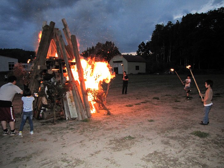 子ども達が点火した後、小さなキャンプファイヤーの周りでフォークダンスです。みんなでマイムマイムを踊りました。