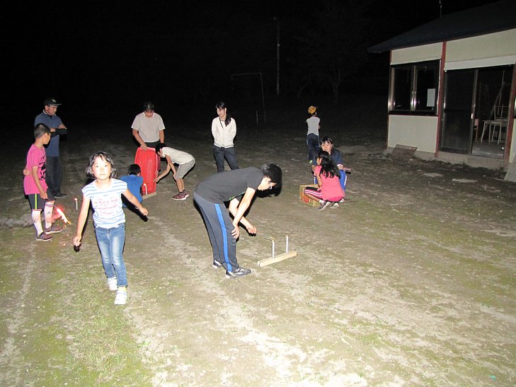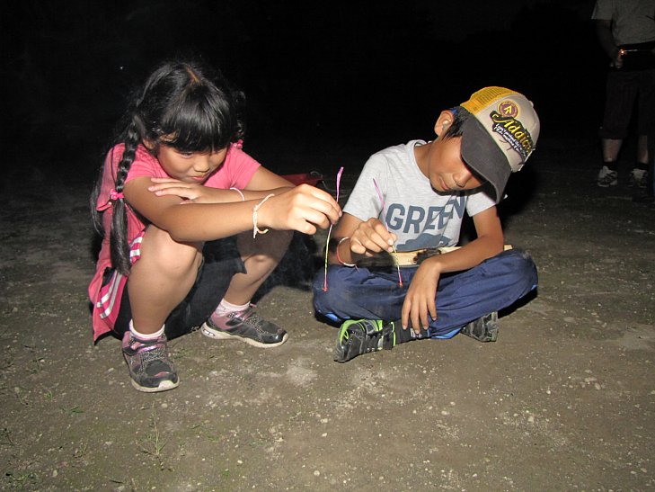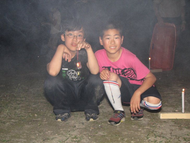 辺りがだんだんと暗くなって来た頃、花火を行いました。花火をしながら歓声を上げる子、静かに線香花火に興じる子など、楽しみ方も人それぞれ。花火の最後にはみんなで吹き出し型の花火や打ち上げ花火を楽しみました。