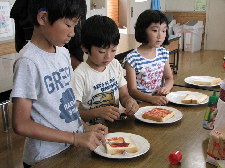 そ後は朝食づくり。パンにジャムを塗ったりピザトーストにしたりと、こちらもそれぞれのチームで協力しながら準備にとりくみました。
