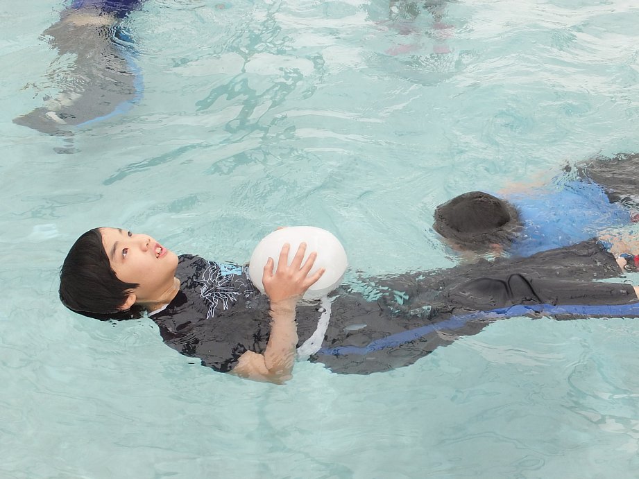 服を着たまま川や海に落ちた場合、あわてて服を脱いだりせずに靴や服の浮力を利用してあおむけのまま水面に浮いて救助を待つ、ということを学び、実際にあおむけになってぷかぷか。「サンダルはいてると足が浮き上がる!」と、意外と靴に働く浮力が大きいことも実感することができました。