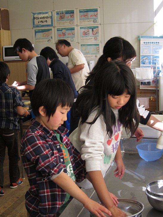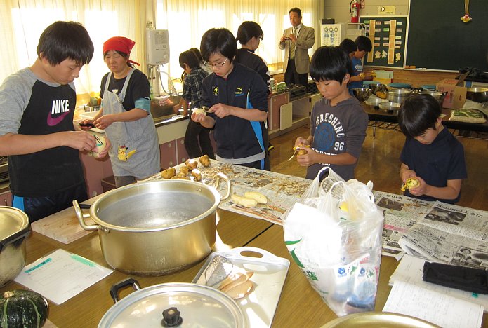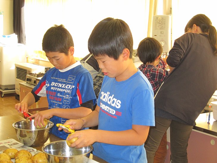 いよいよ明日は収穫祭!今日はその下準備を行いました。不慣れな手つきで、一所懸命にニンジンやジャガイモの皮をむいたり、冷たい水で70食分のお米を研いだり…。たくさんのニンジンの皮をむいて「あ~、疲れた~」という1年生。でも、お家の方や給食の調理員さんはそういうことを毎日やってくれてるんだよ…?そういった苦労も、少しは感じてもらえたのではないでしょうか。