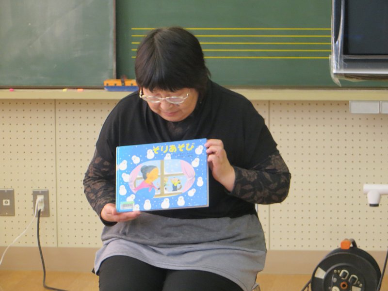読まれた絵本は「そりあそび」「フンガくん」「11ぴきのねことへんなねこ」「かげ」の4冊でした。この日は、4月から緑町小に通う地元の新1年生も参加していましたが、みんな真剣な表情で耳を傾けていました。