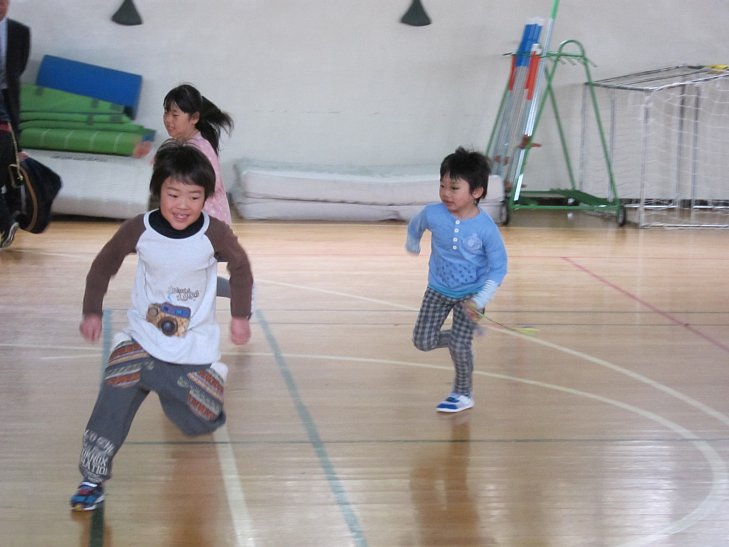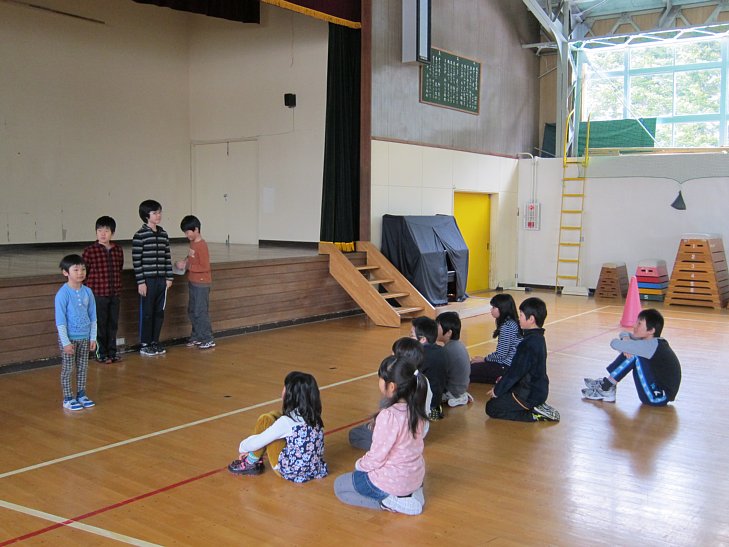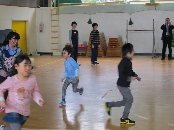 初めのレクは「しっぽとり」。緑町小の児童11名がしっぽをつけて逃げ回り、それを新1年生が追いかけてしっぽをとるゲーム。3分間で8本のしっぽをとることができ、児童会会長から賞状が渡されました。