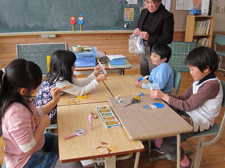 レクの後は絵本の読み聞かせ会に参加し、その後は低学年教室で、1・2年生一緒に授業に参加しました。工作をしたり歌を歌ったりと、楽しみながら授業に参加できたようです。