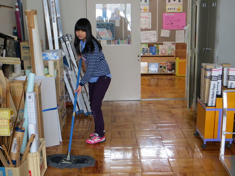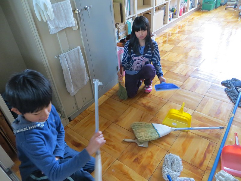 そして今日は、普段あまり掃除をすることのないランチルームの準備室や1年生教室横の教材室、そして体育館のステージ横の器具室の掃除をしました。文句ひとつ言わずに黙々と掃除を続ける5・6年生達。掃除をし終わってスッキリと片付いた部屋を見ながら、「綺麗になると気持ちいいね!」と笑い合っていました。