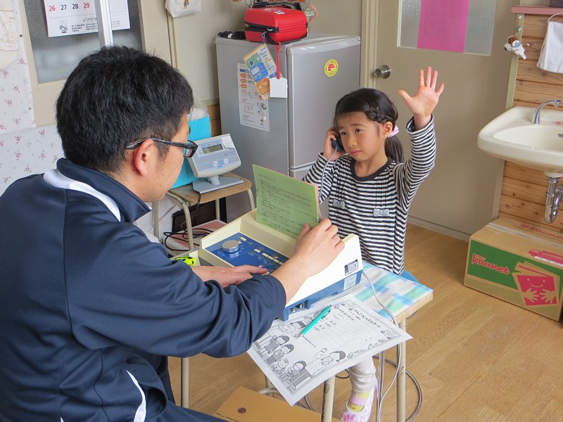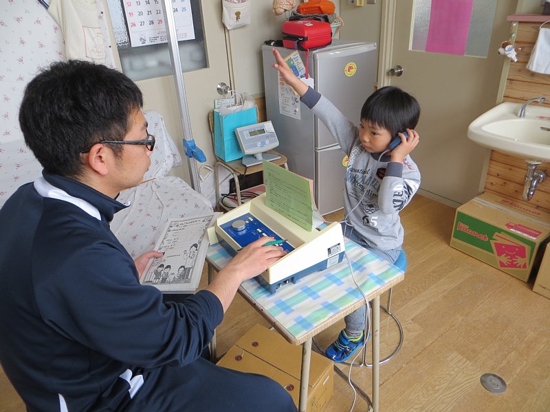聴力検査は、耳に当てたイヤホンから「ピー」という音が聞こえたら手を挙げ、聞こえなくなったら手を下げる、というもの。小学校で初めて聴力検査を行った1年生は、音が聞こえたら元気よく手を上げていました。