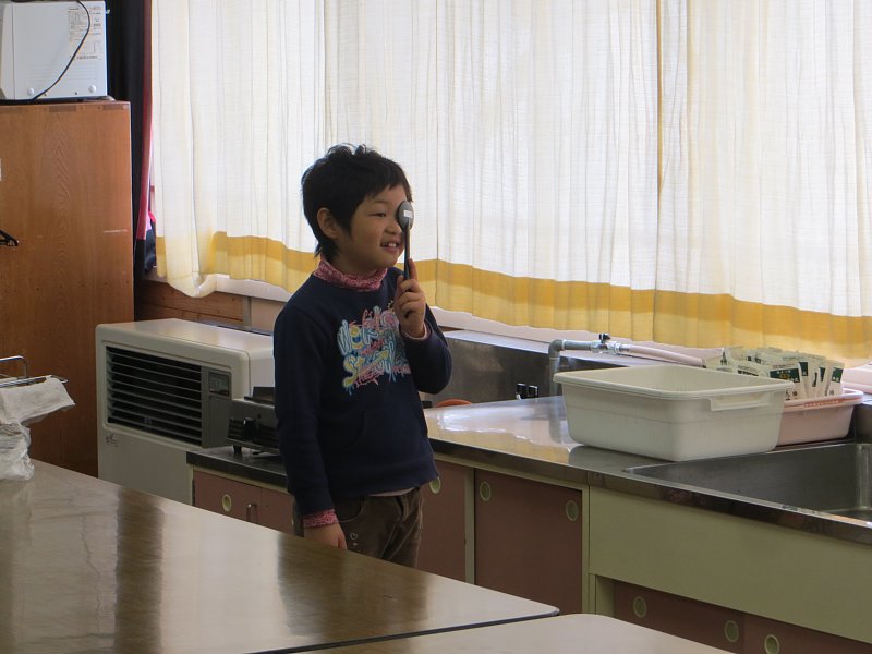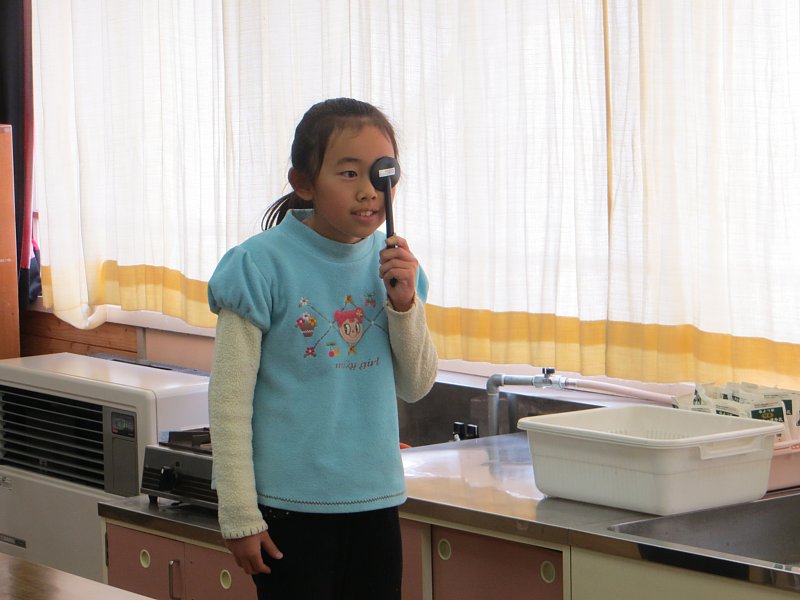 視力検査は昔ながら、片目を隠してランドルト管の隙間の空いている向きを答えるもの。子ども達は、その結果に一喜一憂していました。子ども達の中には右目と左目の視力の差が大きくてショックを受けている子もいたようです…。