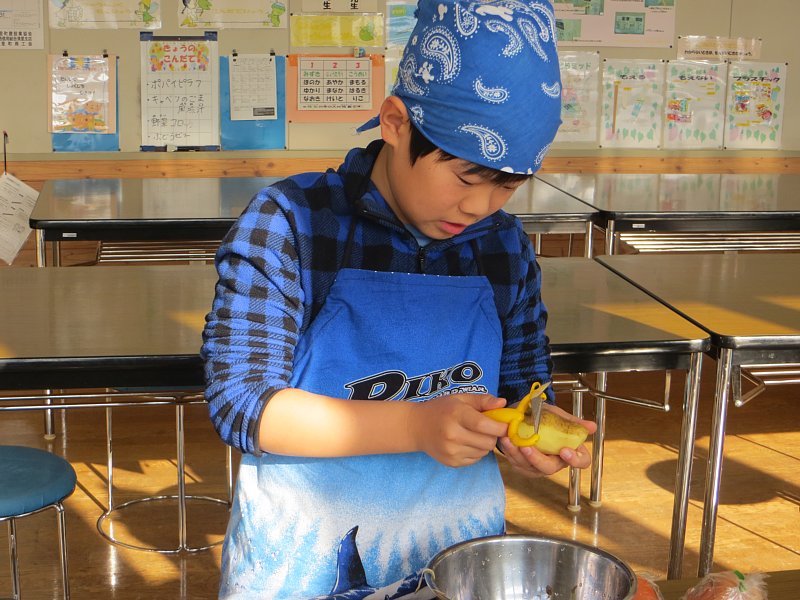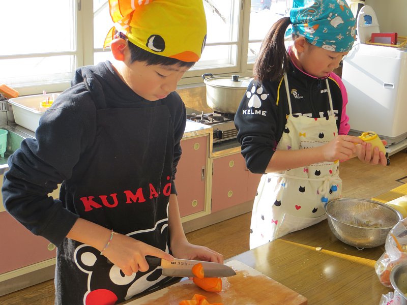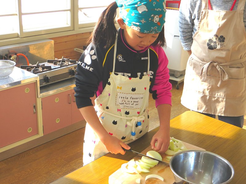 子ども達は、ある子は慣れた手つきで、またある子は少々おぼつかない手つきで野菜の皮をむいたり切ったりしていました。