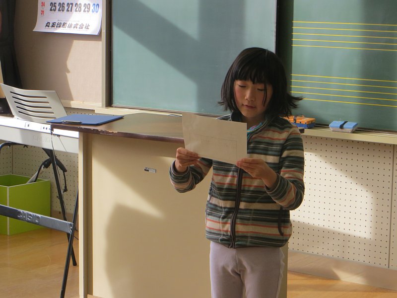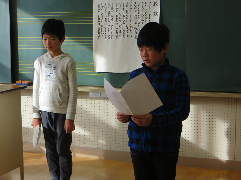 次に、冬休みのめあての反省と思い出の発表を行いました。「休み中、家のお手伝いをすることができました。」「毎日腕立て伏せをすることができました。」「しっかりと睡眠をとることができましたが、これからは早寝早起きも心がけたいと思います。」等、子ども達はそれぞれ冬休み前に立てた目標を振り返り、反省することができました。