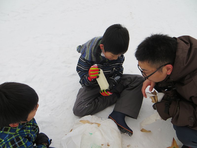 ④20分くらい遊んでいると、アイスクリームが出来上がります!食べてみると、とても濃厚な、高級バニラアイスの味がします!子ども達も、「ただ雪遊びするよりも楽しいしアイスが食べられるからこっちの方がいい!」と笑顔に(^^。