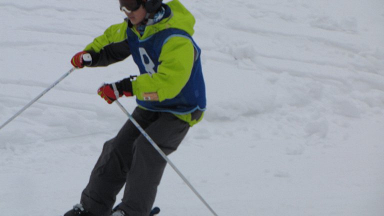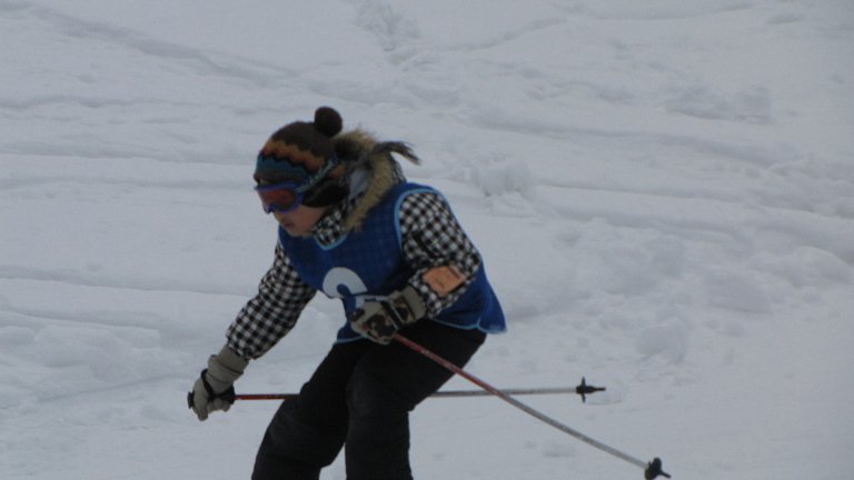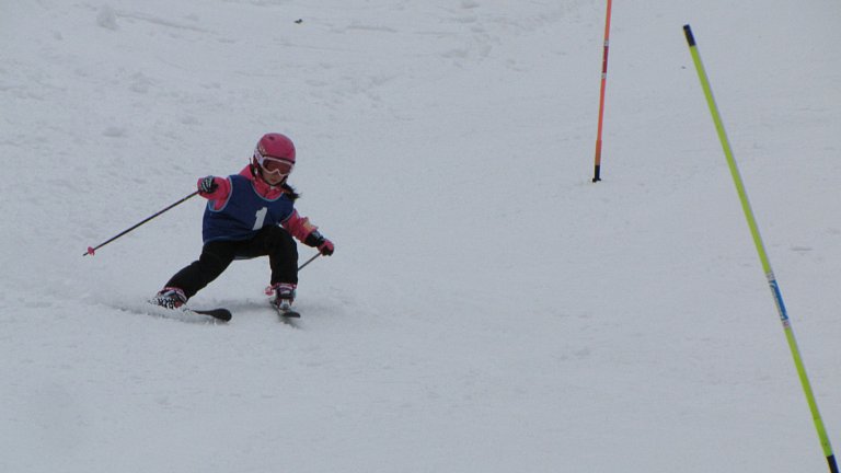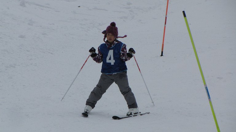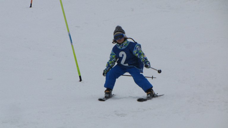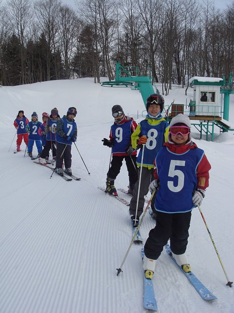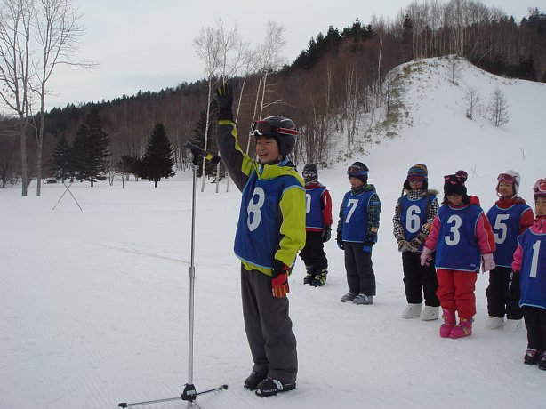 まず始めは、子ども達9名によるデモンストレーションを行いました。スキー学習を始めた当初は立つのもやっとの子や、自分でスキーをコントロールできない子等が半分近くいましたが、この日はファミリーコースを見事なトレインで滑り降りてきました。そして途中から横一列に並び、列がぐちゃぐちゃになることなく下まで滑り降りてきました。そして子ども達の「スキー大会、はーじまーるよー!」の声とともにスキー大会が開幕しました。