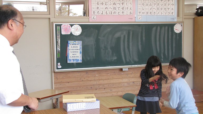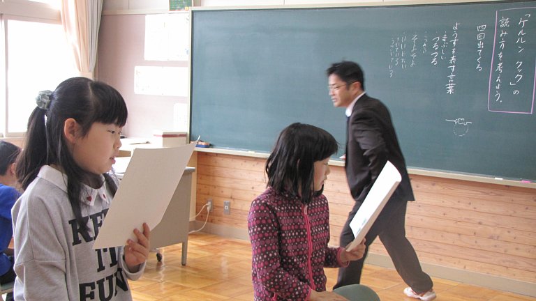 1・2年生は音楽、3・4年生と6年生は国語での授業を行いました。入学したばかりの1年生は、校歌の練習をしました。始めは自信なさそうに小さな声で歌っていたのですが、練習を重ねるにつれてだんだんと大きな声で歌えるようになり、最後には2年生にも負けないくらい大きな声で歌うことができました。その他緑町小に来たばかりの山村留学生の様子、そして昨年度から一つずつ学年が上がった子ども達の様子を見ていただきました。