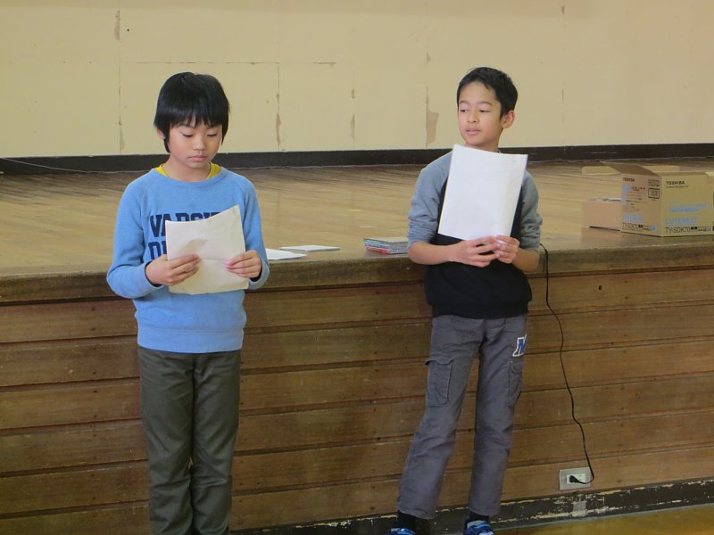 その後は、2~4年生が準備をしたなぞなぞ大会。「新聞紙の上にいる鳥は?」「1回目はチョキで勝ち、2回目はグーで負けました。それでは3回目はどうなった?」といったクイズが出されました。みなさん、答えは分かりますか…?あくまでなぞなぞです、難しく考えないでくださいね(^^;。
