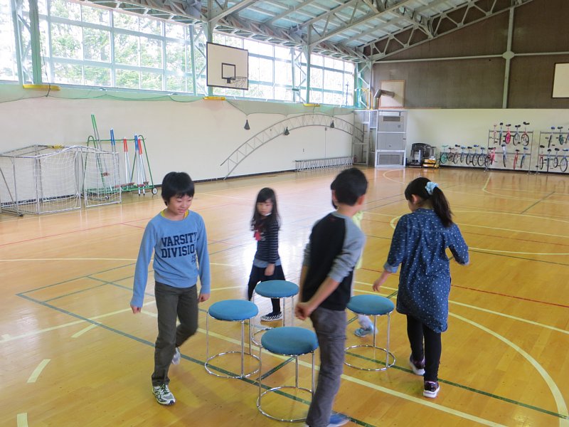 まずは、6年生が用意した椅子取りゲームと鬼ごっこを、職員も入れて行いました。1年生の子は、元気に、楽しそうに走り回っていました。