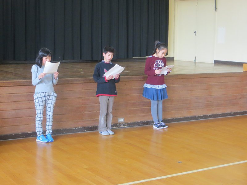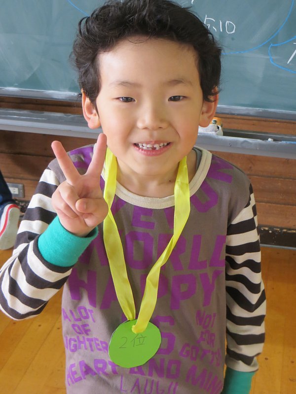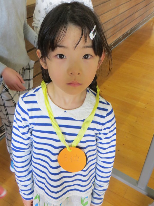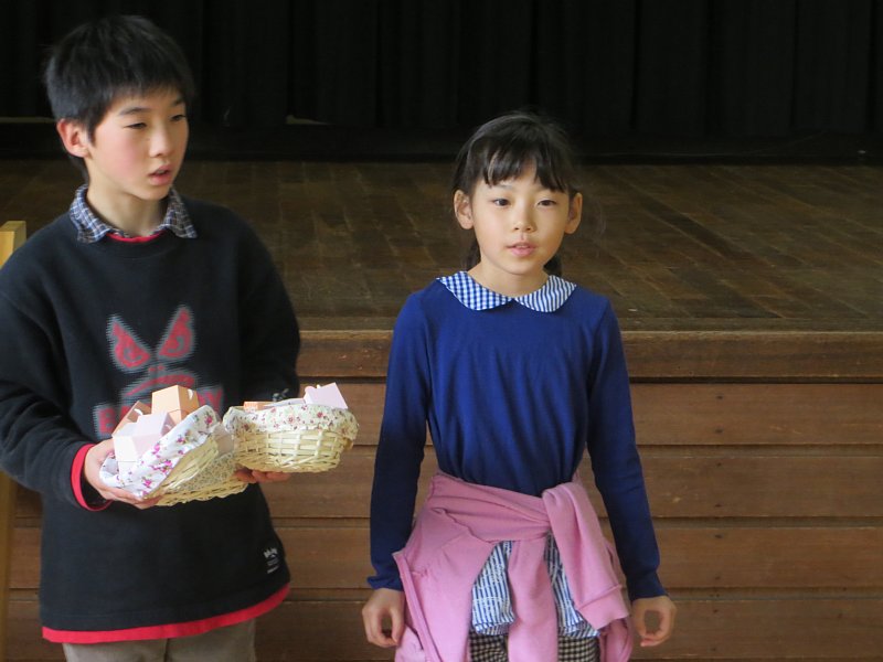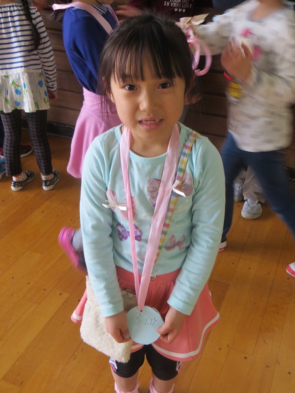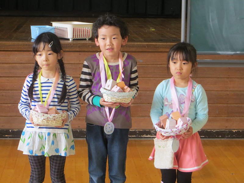 はじめは3・4年生の出し物。はないちもんめと宝探しです。子どもだけではなく職員も入って行われたはないちもんめ。私達には懐かしく、1年生にとっては新鮮な遊びとなったようです。そして宝さがしでは、体育館の中に隠された数字が書かれたカードを探し出します。見事見つけられた子には、手作りのメダルと、折り紙のプレゼント!