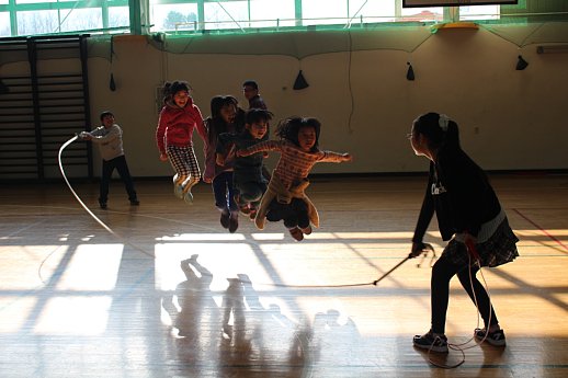 写真では児童二人が縄を回していますが、長縄を回すのもなかなか難しいものです。この後、縄を回すのは我々教員にバトンタッチし、児童6名で跳びました。最初はなかなか上手く跳べませんでしたが、並び方を変えたり跳び方を工夫したりして、15回まで跳ぶことができるようになりました。