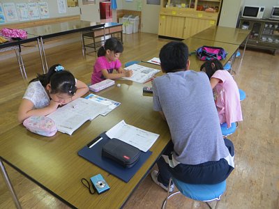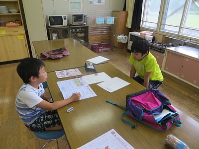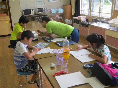 午前9時から始まったこの学習会、本日は4名の児童が参加しました。夏休みの宿題のわからなかった所を聞きに来たり、清里町の学習サポート教室で配られた問題集に取り組んだり、作物の観察のまとめに取り組んだり…。児童は思い思いに取り組む課題を持って参加していました。