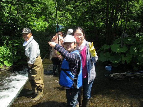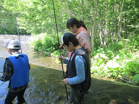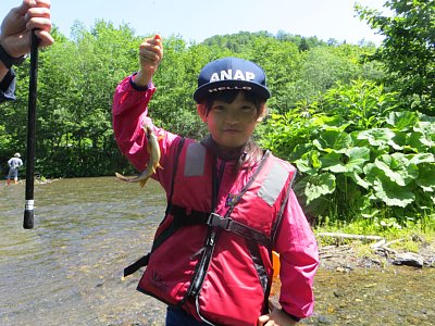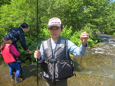 本日は全校遠足でした。晴天の下、片道1.5Kmを歩き、そこからさらに10分ほど車で男鹿の滝方面に向かい、その手前の堰堤が目的地です。子ども達は長靴にライフジャケットの出で立ちで、釣り糸を垂らしたりエサ用の川虫を探したり…と思い思いに楽しみました。釣れた魚は山女魚が3匹オショロコマが39匹の計42匹!これらの釣った魚は、帰校後に炭火で焼いて食べました。保護者の方々に炭火を起こしていただいたり、魚をさばいて頂いたりとお手伝いいただき、その後子ども達が魚に割りばしを刺して塩を振り、それを焼いて食べました。炭火で焼いた魚は身がふっくらとして、川魚特有の臭みもなく淡白ながらも美味しく食べることができました!