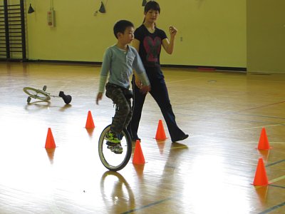 今回、講師をお招きしてのこの講習会ですが、補助なしでは乗れなかった子が補助なしで乗れるようになったり、アイドリング(車輪を前後に動かしながらその場に留まる乗り方)が苦手だった子ができるようになってきたり、子ども達が一輪車に乗る姿勢が良くなったりと、わずか2時間ではありましたが、子ども達がめきめき上達していくのが分かりました。