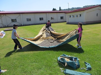 始めに学校の裏手にテントを張り、その後お楽しみ会でプール遊びをした後、食事の準備をしました。