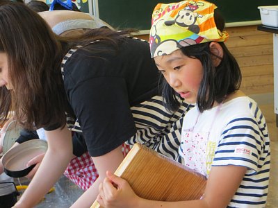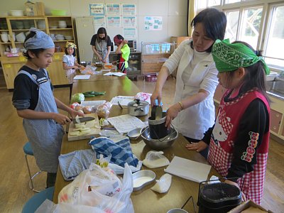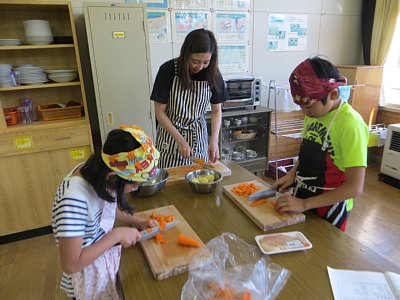 カレーは3年生と6年生がていねいに野菜を切って、炒めて味付けをして。2種類のルーを混ぜることでより美味しいカレーに仕上がりました。大根サラダは4年生が担当。慣れない手つきながらも一所懸命に大根や玉ねぎ、トマトを切りました。