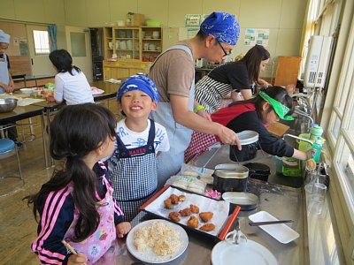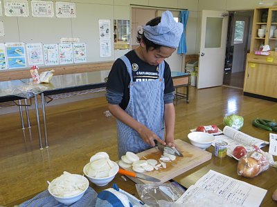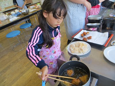 夕食のメニューは、チキンカツカレー、と大根サラダ。チキンカツは1・2年生コンビが衣をつけるところから揚げるまで担当。上手にサクサクに揚げることができました。