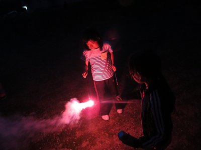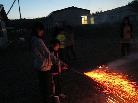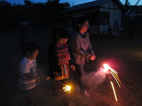 花火は、最初手持ちの花火ををやってから、打ち上げ、吹き出し花火大会。花火が打ちあがっては「おぉ~」、シューッと噴き出しては「きれい~」と声が上がっていました。