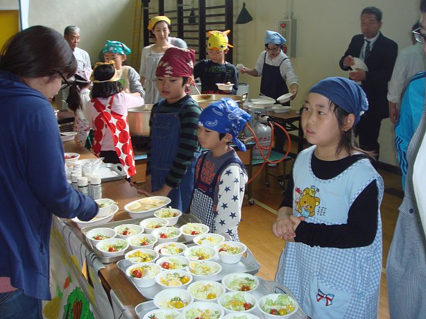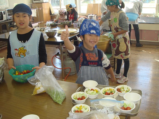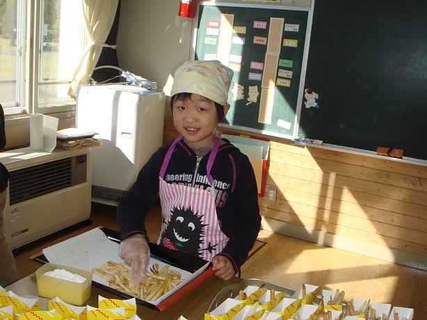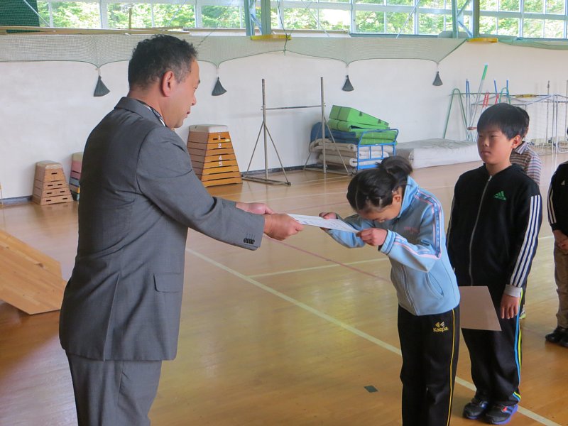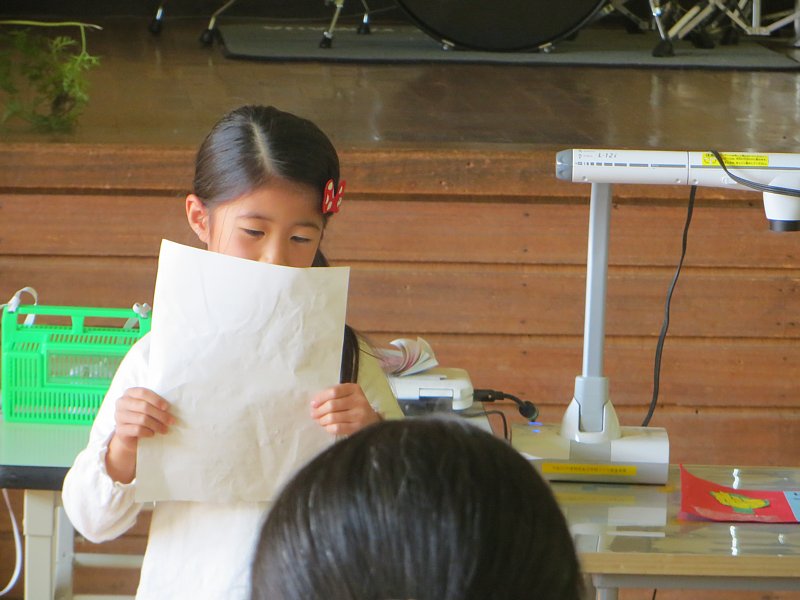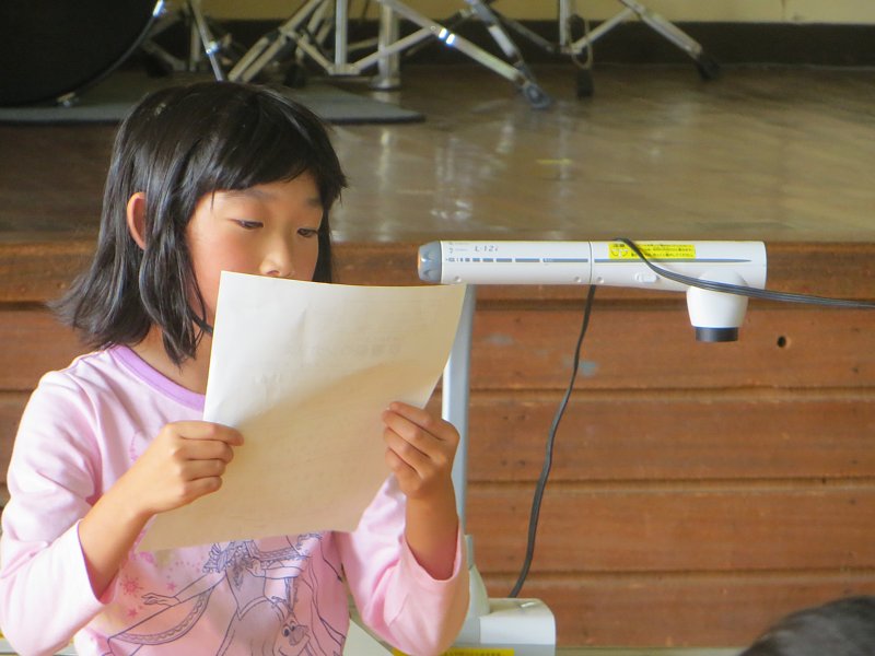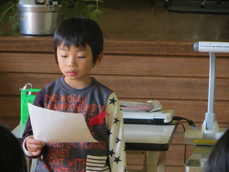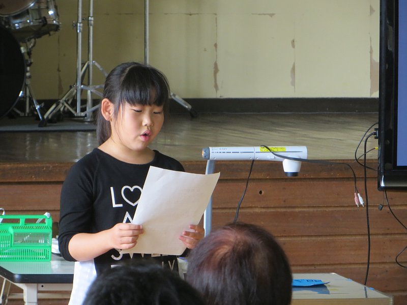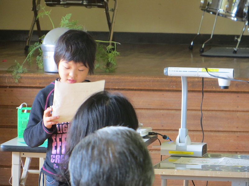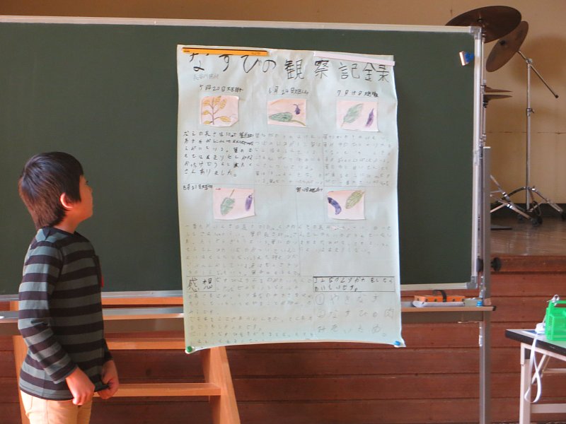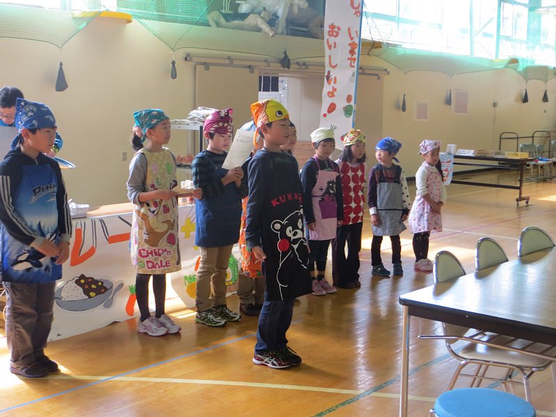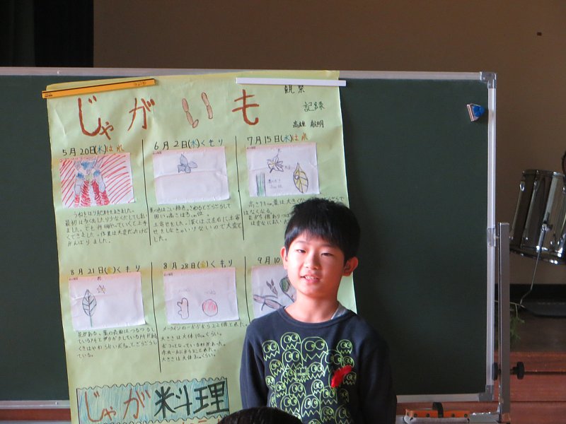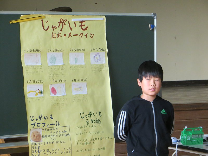 今年は、カレー、サラダ、フライドポテトの3品を用意。子ども達は朝から調理に励みました。 この日、初めて包丁でピーマンを切った子は、最初「怖い~、先生やって~」と言っていましたが、切り方を教わりながら練習し、最後には一人で何個もピーマンを切ることができました。 5・6年生は下の学年の子達に指示を出しながら、調理の仕方を教えながら、自分達も調理を行っていました。とても忙しい状況でしたが、高学年の子達はきびきびと動いていました。 10時25分からは、観察記録発表会を行いました。 1年生はトウモロコシを育てながら記録した観察記録用紙をテレビに映しながらの発表でした。原稿を見ながら、大きな声で発表することができました。 2年生は、玉ねぎの観察記録の発表です。発表方法は1年生と同じでしたが、さすが2年生、大きく、聞き取りやすい読み方で堂々と発表することができました。 4年生はパワーポイントを使用しての発表です。枝豆の観察記録を、作業中の写真をたくさん使い臨場感あふれる発表をすることができました。 5年生はなすびの観察記録です。壁新聞にまとめました。観察記録を発表した後、自分たちで調べたなすびの美味しい食べ方を発表したり、苦労したことや感じた事などを感想として発表したりすることができました。 最後は6年生。ジャガイモの観察記録を、5年生と同じく壁新聞にまとめての発表です。これまでの経験と照らし合わせて考察したり、実際に調理して食べてみた感想を発表したりと、6年生らしい発表となりました。ジャガイモの名前の由来なども調べて発表していました。 昨年度の発表会では、「声が小さくて何を言っているのかよくわからなかった」といった感想を頂いていました。今年度は、司会の子も発表者も、「マイク無しでお客様に聞こえる発表を」を目標にしてきましたが、お客様の感想からは「声も大きく、はっきり聞こえた」「分かりやすい発表だった」とお褒めの言葉を頂きました。これも、子ども達の努力の賜物です。 発表会の後は、収穫祭です。子ども達が心を込めて作ったカレーやサラダ、フライドポテトを、ご来場のお客様に食べていただきました。 「どれも美味しかった」「カレーは、今までの中で一番おいしかった」「子ども達が、進んでサラダの説明をしてくれた」等々、たくさんのお褒めの言葉を頂きました! カレーは、甘口・辛口の2種類を用意したのですが、「せっかくだから両方食べてみたい!」とおかわりをしてくださる方も大勢いらっしゃいました。 最後に、1・2年生からお客様にジャガイモのお土産をお渡しして、収穫祭は終了しました。 たくさんの方にご来場を頂き、誠にありがとうございました。 また、当日は食育の一環として清里小学校の栄養士の先生にもお越しいただき、調理の際にご指導いただきました。この場をお借りしてお礼申し上げます。 (文責:すずき) 今日の2校時目に、1学期の終業式を行いました。4月からの半年間を無事終えることができましたのも、偏に保護者の方々や地域の方々の、本校の教育活動に対するご理解とご協力があればこそと、心より感謝申し上げます。